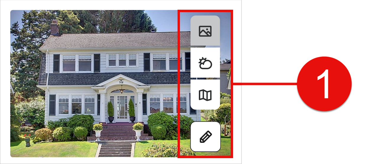 At the top of the screen, Property Vision displays the default property photo. Tap the icons on the right to switch between the photo ( ), current weather ( ), and a location map ( ) of the property.