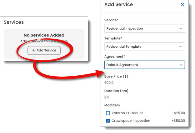 Click + Add Service in the Services section to adjust various options for the inspection: