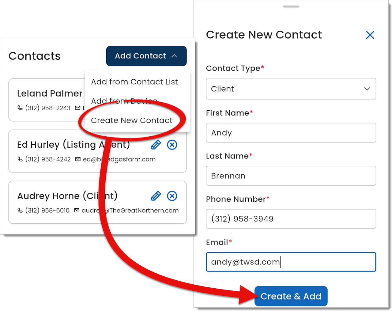 3. Select the Contact Type, edit the details as needed, and press Create & Add.