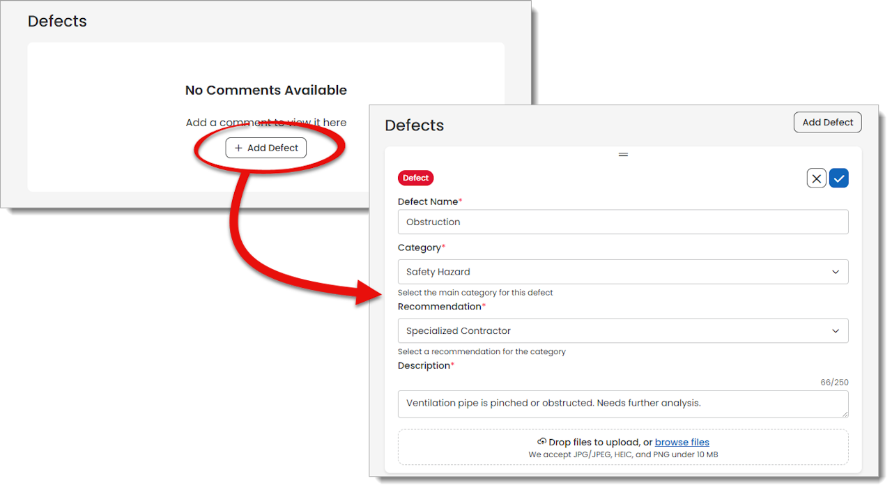In the Template Editor, click + Add Comment, + Add Limitation, or + Add Defect within a section to insert a new comment. If no comments exist for a section, the panel displays No Comments Available.