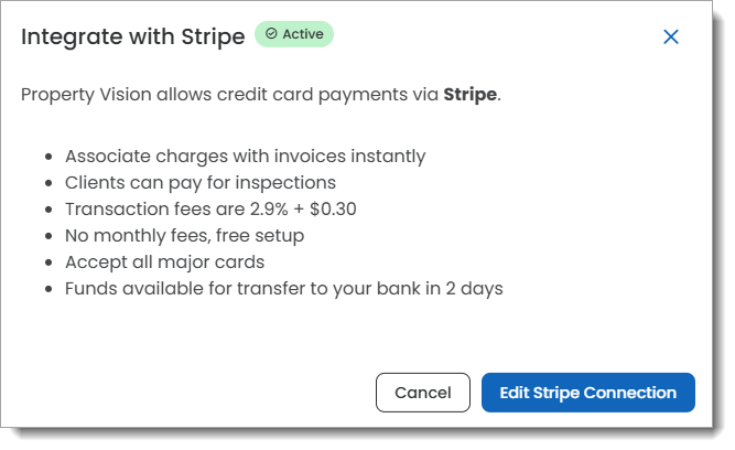Property Vision includes online credit card processing via Stripe integration for you to quickly and easily accept payments any time, anywhere, and process payments securely. Stripe integration allows you to accept credit card payments online before your client accesses the final report, giving you peace of mind that payment for your hard work won't be left to chance.