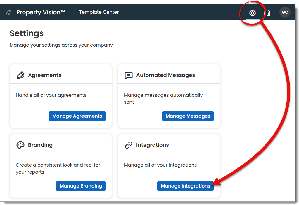 To connect your Stripe account to Property Vision and enable Stripe integration, begin by logging in to the Property Vision Website and navigate to the Template Center.