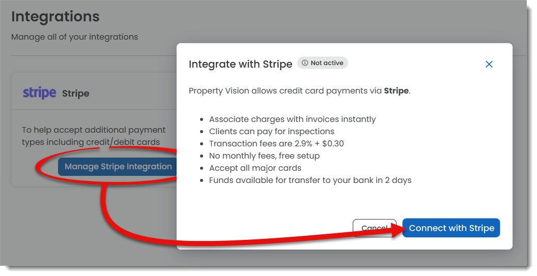 Click Manage Stripe Integration on the Integrations page. Then, review the integration benefits and click Connect with Stripe.