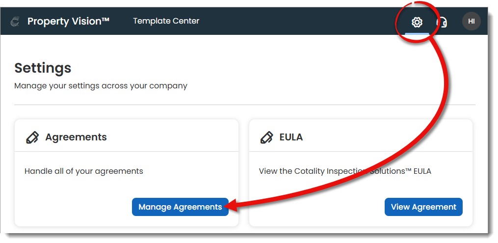 To begin, log in to the Template Center, click the settings icon (  ) on the upper right, and click Manage Agreements on the Settings page. Then, click +Create New to create a new agreement.