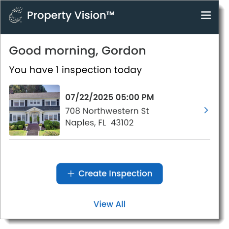 When you launch Property Vision,a personalized greeting and today's inspection schedule is displayed. Tap an inspection to view its details.