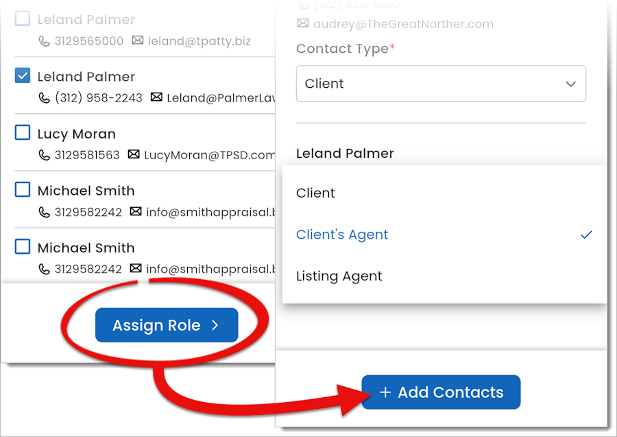 3. Then, use the Contact Type dropdown to assign a role to each contact and press +Add Contact.