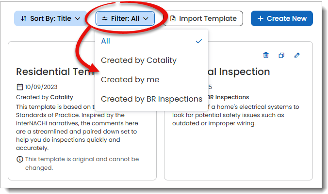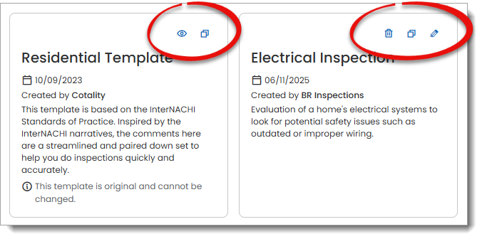 ) – Original templates created by Cotality cannot be edited or deleted. Instead, these cards display a View icon that allows you to open and review the contents of the template.