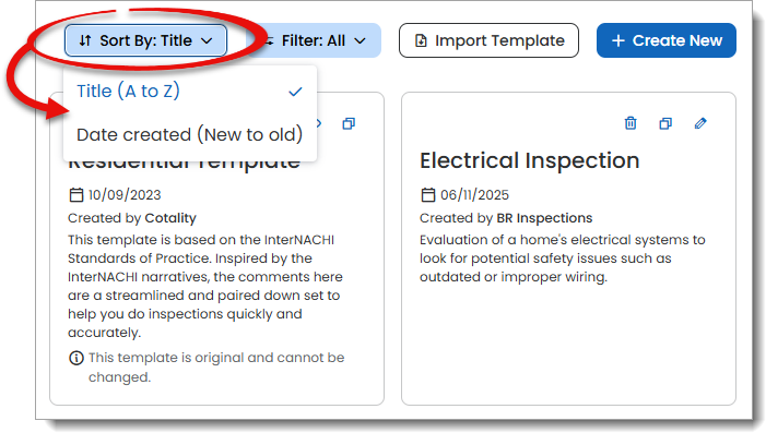 Date Created (New to old) – Sorts templates by creation date.