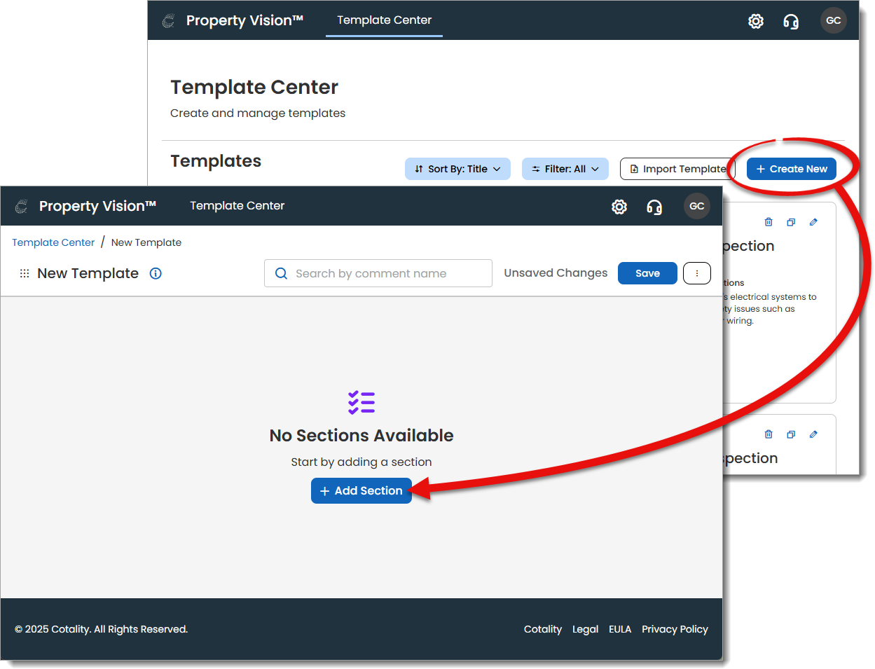 The Template Center is where you build and organize the inspection templates that define the structure of your reports. Templates control the layout of sections, items, and comments, and allow you to standardize your workflow across inspections.