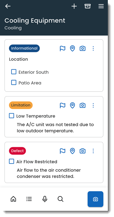 Each item in Property Vision contains three categories of comments: Informational, Limitations, and Defects. Comments allow you to document observations, note restrictions, and record issues during an inspection.
