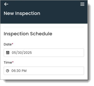 In the New Inspection form, enter or select the inspection Date and Time in the Inspection Schedule section.