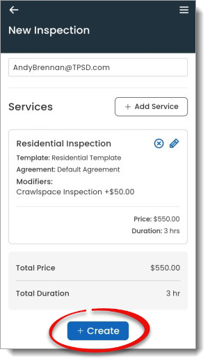 When you're finished, tap + Create at the bottom of the form to save the inspection.
