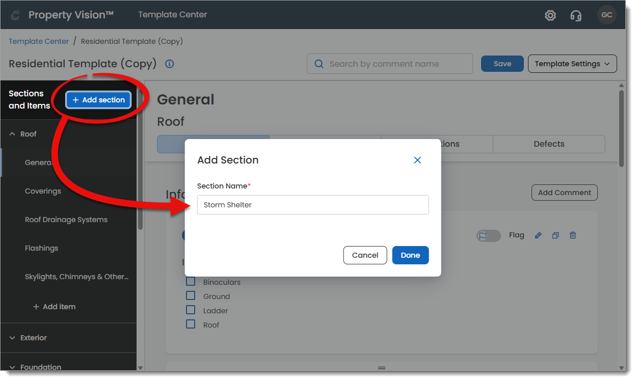 In the Template Editor, click +Add Section, enter a Section Name, and click Done to create a new section.