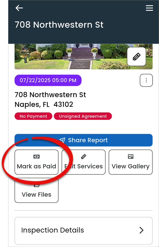 Once the inspection is complete, return to the inspection overview and tap Mark as Paid to finalize billing. Click here for detailed instructions.